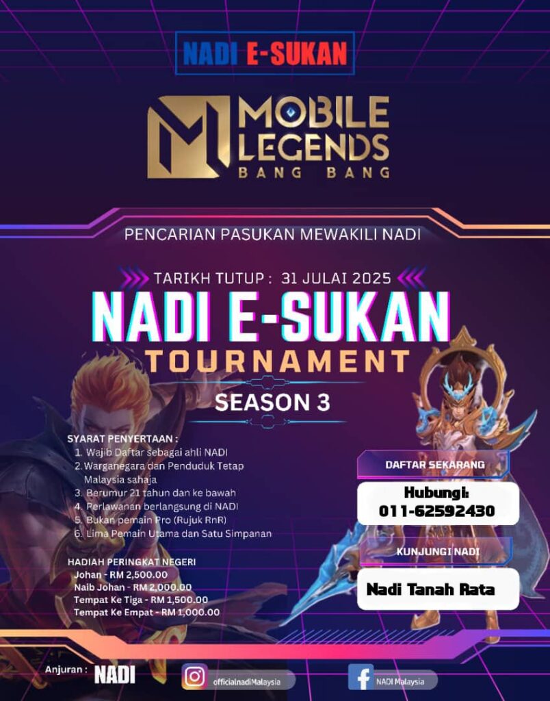 Dengan hormatnya kami mengumumkan pembukaan pendaftaran rasmi bagi NADI E‑Sukan Tournament – Season 3, terbuka kepada semua warganegara Malaysia dan penduduk tetap yang berumur 21 tahun dan kebawah.